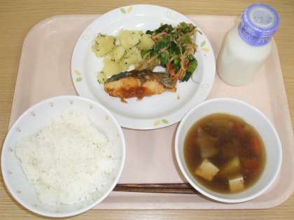 今日は旬のおいしい野菜をいろいろと使った給食でした。根菜をたくさん入れた「けんちん汁」、青々とした小松菜を使った「野菜のごまだれかけ」。野菜をたっぷり食べて、病気に負けない体づくりをしていきましょう。
