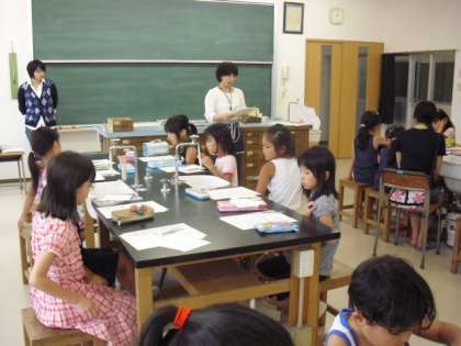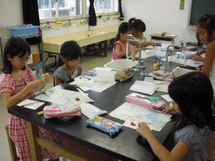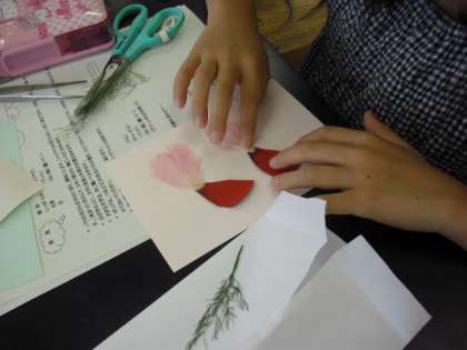 サマーワークショップ「押し花で暑中見舞いを作ろう!」を理科室で行いました。押し花の作り方、暑中見舞いについてのお話の後、作品づくりにとりかかりました。一つ目の作品は、共通課題で花びらを使って「金魚」を描きます。体はバラ、尾びれはシャクヤクの花びらです。