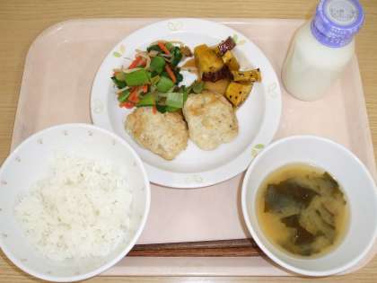 「サクサクつくね」は、生地の中に刻んだ“れんこん”を入れて、サクサクした食感を楽しめる料理です。かわいい小判形サイズは、一人2個ずつ!給食室では、全校分で2000個以上にもなる小判を1つ1つ丁寧に形作りました。