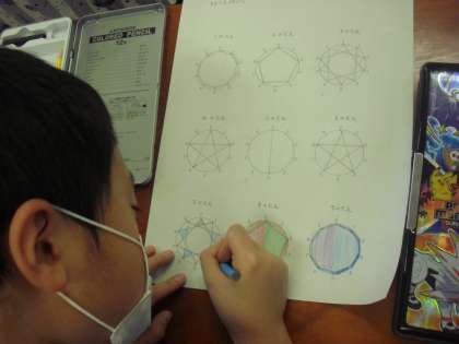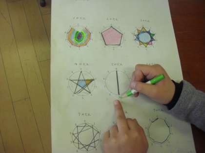 円周上に置いた0から9までの点を、かけ算九九の答えの下1けたの数字の順に結んでいくと・・・模様が浮きあがってきました。
