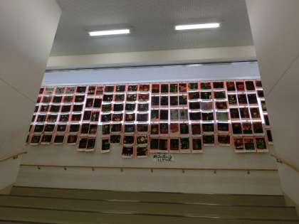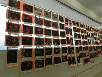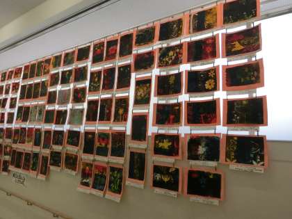 3階を過ぎると、目の前にドーンと迫力ある作品群が! 仕上がった版画は一瞬にして見ることができますが、ここまで制作者にとっても指導者にとっても、大変な道のりがあったはずです。一枚、一枚に刻まれた努力のあとを感じ取る思いで、鑑賞させてもらいましたよ。