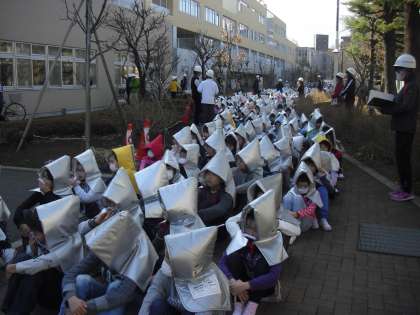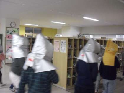 小学生はいつもの校庭ではなく、中学生はテニスコート、小学生は北門側への避難です。「おさない・かけない・しやべらないお・もどらない」の約束を守って、静かに避難できましたね・・・。