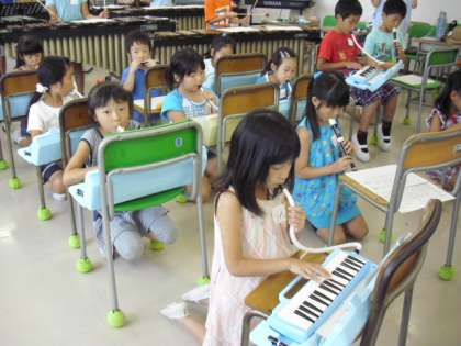 10時から音楽室で、サマーワークショップ「みんなで『嵐』を演奏しちゃおう!」を行いました。この講座には1年生から6年生までのすべての学年が参加しました。嵐の「ハピネス」という曲を、全員が楽器を分担して演奏します。渡部校長、4年の瀧藤先生、家庭科の渡部先生も参加しました。