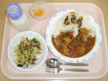 月に1度のカレーライス給食。今日は、角切りの鶏肉を使った「チキンカレーライス」です。いろいろな調味料・香辛料を隠し味に入れて、芦花小学校だけの味に仕上げています。
