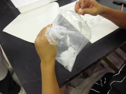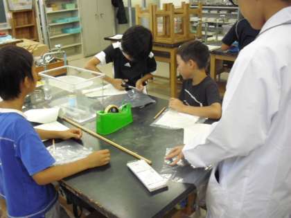 サマーワークショップ「マジカル・シャボン」〜気体の性質〜を中学校の理科室で行いました。まず、シャボン玉の中身の気体を、二酸化炭素、酸素、水素、ガスと変え、空気中に浮くか沈むかの実験をしました。白衣を着た中学生がチューター役として小学生に教えてくれたので安心して実験ができました。