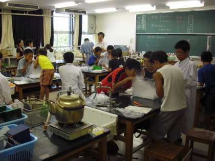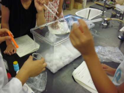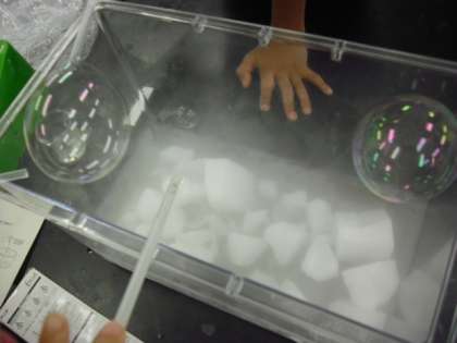 最後は、ドライアイスにシャボン玉を入れて浮かせる実験をしました。ゲーム感覚で子どもたちは楽しんでいました。中学生に温かく見守られながら、実験を楽しんだ小学生でした。