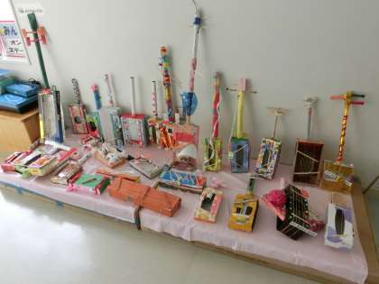 3階の廊下に、こんなネーミングのコーナーが設けられていました。教室では、創造する楽しさが伝わってくる活気あふれる授業が進行中、カラフルな作品群に「みんなでオン・ステージ」のネーミングを納得しました。3年生による、ノリノリの演奏までもが聞こえてきそうな雰囲気ですね。