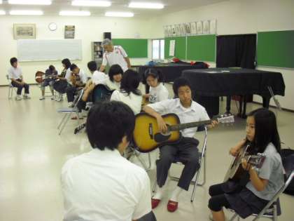 サマーワークショップ「アコースティックギター教室」の様子です。中学校の音楽室で行いました。ちょっとしたコンサート会場のようでした。まずは、中学校のアコースティックギター部が各自のレパートリーを披露してくれました。その後、中学生と小学生が4つのグループに分かれて小学生にギター弾き方教えてくれました。