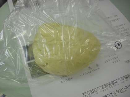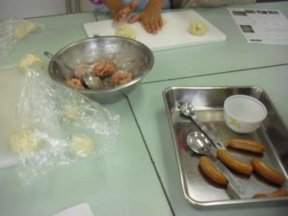 丸めた粉はビニール袋に入れて、冷蔵庫でねかします。その間に、具の準備です。あらかじめ講師の先生が分量を量ってボールに入れておいてくださったので、混ぜるだけです。スプーンで団子状にしていきます。冷蔵庫から取り出した皮を、作る数だけちぎっていきます。それを手で平たくのばし、その上に具の団子をのせます。