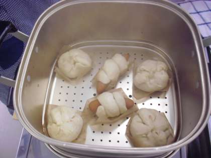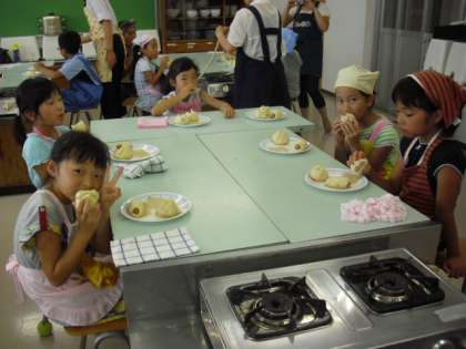 蒸し器に入れ、待つこと数分。肉まんが蒸し上がりました。自分で作ったんです。おいしいに決まってますね。見てください。この満足そうな子どもたちの表情を!あしか隊の方々、保護者の方々ご協力ありがとうございました。今度はお家で家族といっしょに作ってみましょう。