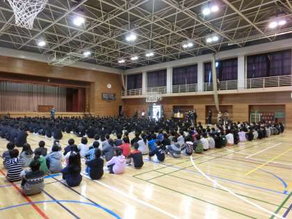 低学年の子でもわかるよう、かみ砕いて話される小学校の朝会とは違い、さすが中学校、ハイレベルな内容です。