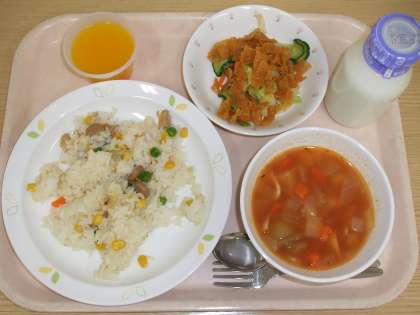 北風が冷たい日には、温かいスープがうれしいですね。今日は具だくさんの「ミネストローネ」をいただきました。具材の中でも、貝殻形のマカロニが人気だったようです。