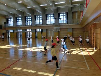 2年生が鬼遊びで、ひろ〜いフロアを目いっぱい使って走り回っています。都心の学校によっては、校庭が本校の体育館程度の広さしかないケースもあることを思うと、芦花小のみんなはのびのびと全身を動かす環境が整っていて、いかに恵まれているかがわかります。今のクラスの、今の仲間と過ごす日々も、悔いのないものにしていきましょうね。
