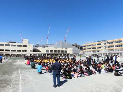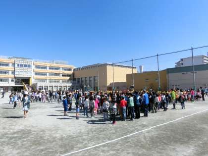 楽しい外遊び中の訓練開始に、放送が流れた直後はざわつきがあったのは確かです。しかし、すぐにいつもの芦花小魂を発揮、中盤からは落ち着きを取り戻して進行することができました。4分30秒で、小中全員の避難と安全を確認。前回より時間短縮を達成できました。マル!