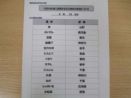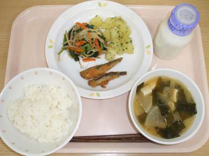 今日の給食はミネラルがたっぷりです。ガーリック揚げの“小いわし”、みそ汁の“生わかめ”、お浸しの“小松菜”。小魚や海藻は苦手・・・という児童もいますが、丈夫な体をつくるためには欠かせない栄養素が含まれています。家庭でも積極的に料理に使って欲しいです。