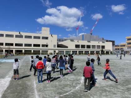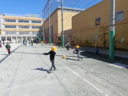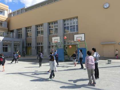 ポカポカ陽気に変わった中休み、ボール遊びに興じる子が目立ちました。1年生のサッカー、3・4年生対抗のドッジボール、6年生のバスケットボールのショットをお届けします。