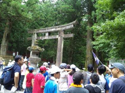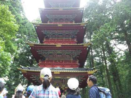 日光東照宮に着きました。入口の鳥居です。上の石が下の石の上にバランスよく乗り、押さえる形になっているそうです。古くなって来ているのでしめ繩は付けていないそうです。次の写真は五重塔です。ここの五重塔は一番下の屋根が雪の関係で大きくならず、ほとんど全部同じ大きさになっています。