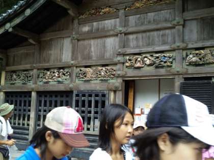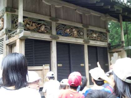 「見ざる、言わざる、聞かざる」の三猿です。子どもたちは「これがそうなんだ」と感慨深げでした。「思っていたより小さい」とか「高い場所にあるんだ」などと口々に言っていました。ここにいる16匹の猿たちは人間でいう人生を表しているそうです。