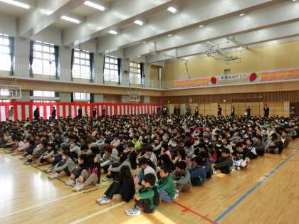 いつもの児童朝会では、週番の先生が舞台にあがっていましたが、今朝は誰も登場しませんでした。それにもかかわらず、全員が揃ったタイミングでごく自然に話し声は消え、指示や注意等がいっさいなくてもスタンバイOKに。これこそが芦花小学校! 一年間の集大成にふさわしい姿が具現化したところから、修了式が始まりました。