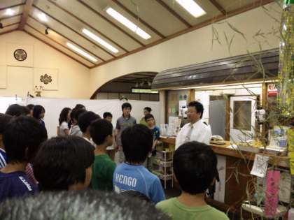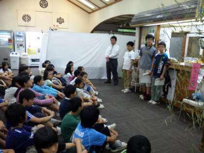 林間学園3日め、いよいよ最終日です。今日の天気は雨。でも朝会は外で行うことができました。終了後に雨が降り始めました。最後までついている芦花小6年生です。今日は雨ですが、ワールドスクエアなので予定通りに行います。