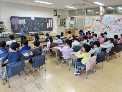 授業開始時のお約束、これからたくさんお世話になる連絡袋の使い方について話を聞いています。