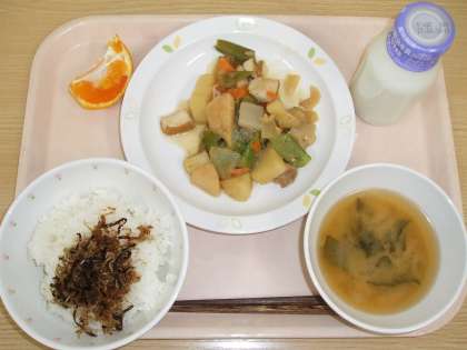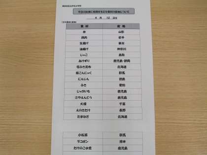 今日の給食は、旬を迎えた春野菜をたくさん使って、「春野菜のうま煮」を作りました。“ふき”や“さやえんどう”の筋取りも、給食室で丁寧に行います。1000人分以上の野菜の下処理は、本当に一苦労です。