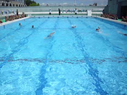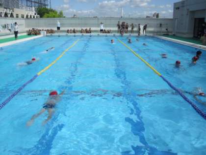 今日の水泳教室では、距離泳の検定を行いました。5・6年生はコースロープを使って距離泳の検定をするコースと明日の検定に向けて泳ぎ込むコースに分けて行いました。3・4年生は、距離泳を受ける子どもが少なかったので、一斉に行い、みんなで応援しました。受けた子どもたちは、100mを泳ぎきりました。1・2年生は、距離泳を受ける子どもはいないので、水慣れのあとは、級別に分かれて、明日の検定に向けての練習をしました。自分の目標を目指して、力を出し切ってほしいです。