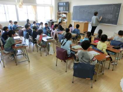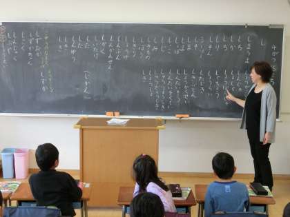 「し」で始まる言葉集めをしています。まだ文字表記が出来なくても大丈夫です。テンポよく、思いついた子からどんどん口頭で発表していきます。参観者も飛び入りし、わずか10分位の間に目標をはるかに超える50語が集まりました。その中には、1年生とは思えないような高度な語句も登場し、先生もビックリしていました。集団での学び合いを通して、語彙力を高めていきましょう。