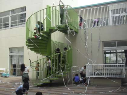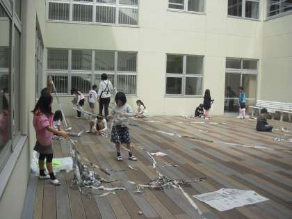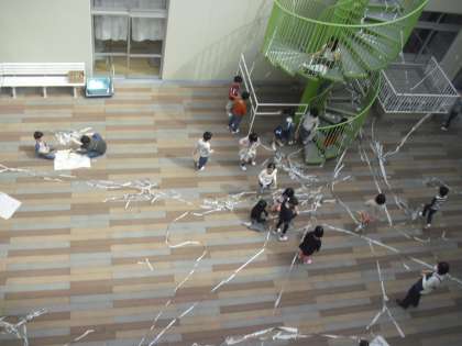 3年生が2階のコミュニケーションテラスで図工の学習です。新聞紙などで作った長ーい紙を伸ばし吊るし、造形活動をしていました。どんなすてきな世界が生まれてきましたか・・・