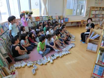 図書室で読書の時間を過ごしている2年生。担任の先生の前に集まり、本の読み聞かせに耳を傾け、じっくりと聞き入っていました。この雰囲気、とっても好きです。みんなの表情がとっても柔らかくなるひとときですからね。
