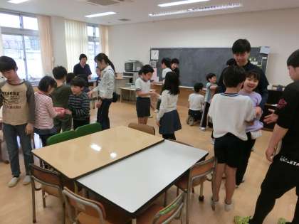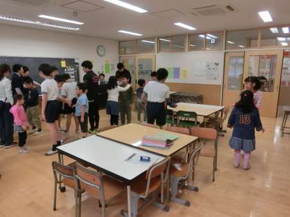 「あくしゅでこんにちは」の歌に合わせて、みんなが身体表現に取り組んでいます。設定された状況に浸り切って、笑顔で握手をしながら対面したり、お別れの身振りをしたりしています。学年、性別関係なく、和やかに交流する雰囲気が心地よい空間です。