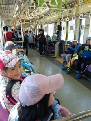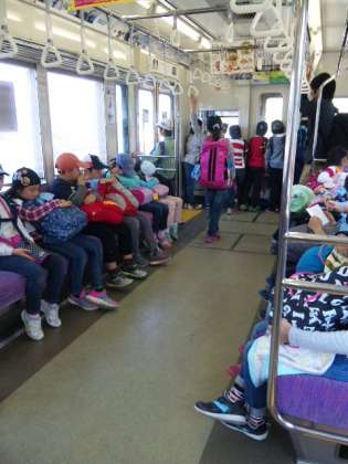 4年生は電車に乗って学校に向かっています。トイレ渋滞のため、予定の電車とその次に2クラスずつ分乗しています。予定の帰校時刻より、20〜30分遅れます。よろしくお願いします。