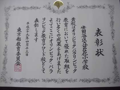 昨年度、オリンピアンを招いての講演や実技指導などを行いましたが、優れたオリンピック・パラリンピック教育を行った学校として東京都教育委員会から芦花小学校が表彰状をいただきました。学校での取り組みを認めていただく機会を得て、取り組んできた教職員も大変うれしく思います。今年度も体力向上や生き方教育(キャリア教育)の取り組みの一環として、オリンピアン・パラリンピアンを招いての講演や実技指導を計画しています。その際にはお知らせしますので、ぜひご都合をつけ活動をのぞきにいらしてください。