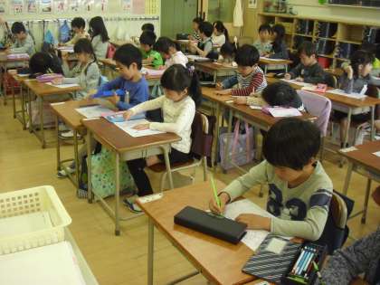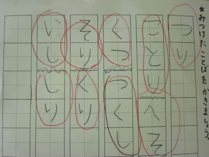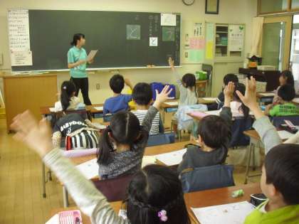 ひらがなの学習をしている1年生、習ったひらがな九文字を並べてできる「ことばみつけ」に挑戦していました。自分で考えて、隣の人と意見交換をして、全体で発表です。