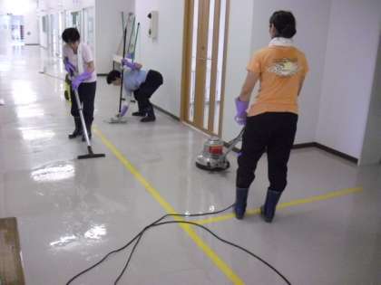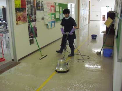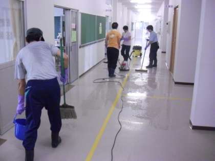 今日は、主事さん方が第1昇降口から職員室前までの1階廊下のワックス掛けをしてくださいました。まず、掃除機やモップを使って、掃き掃除です。次に、廊下の汚れを落としていきます。洗剤を薄くのばす、機会を使って磨き上げていく、磨いた後の汚れた水を集め吸い取ると、役割を分担しながら、丁寧に廊下の汚れを落としていきます。
