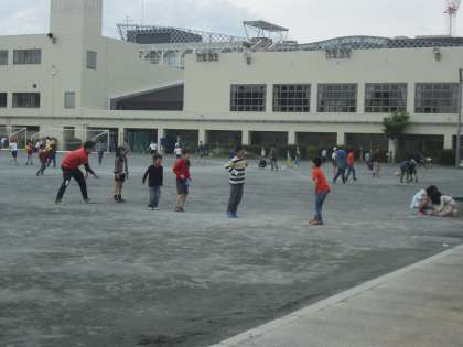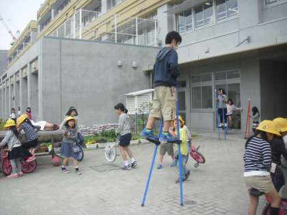 休み時間は校庭に出て外遊び〜竹馬に挑戦する子どももいました。