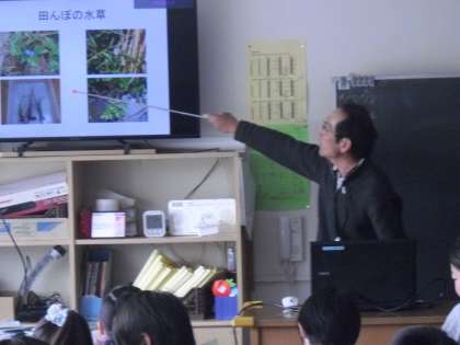 5年生の稲作の学習に、その道のエキスパートであるゲストティーチャーの方を迎えご指導いただいていました。田畑に生息する実際の生き物も観察〜今後の学習に生かしていきましょう。