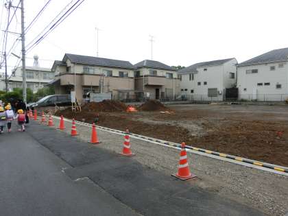 南門から南方向へ向かう道路、現在改修工事が行われているマンションの向かいの空き地で、まもなく建築工事が始まるとの情報です。現地でお会いした、とあるお母様は既にご存知でした。