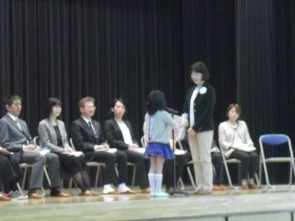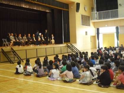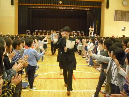 今日は学校を去られた先生方をお迎えしての離任式でした。代表の子どもたちがお礼の言葉を述べ、手紙を渡しました。先生方と一緒に校歌を歌って・・・