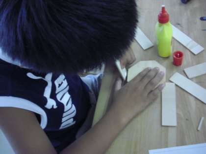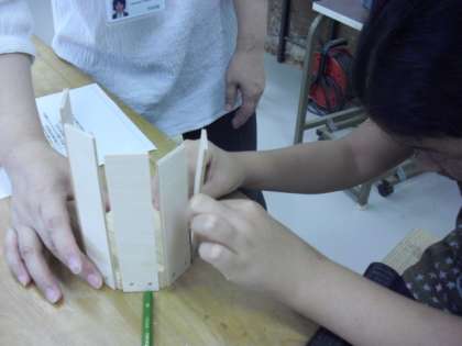 切り取ったベニヤ板を、ペン立ての底になる木の板にボンドと釘を使って固定していきます。思い思いに、長さの違うベニヤ板を並べながら取り付けていきます。金づちを使って、釘を真っ直ぐ打ち付けるのが難しかったようですが、だんだんと形になってきました。