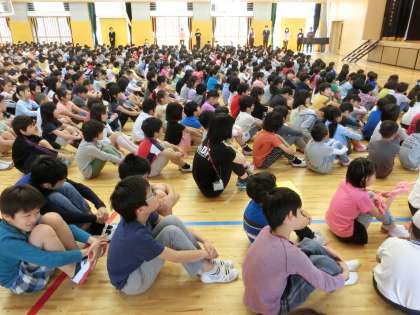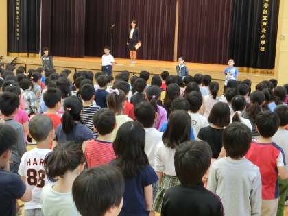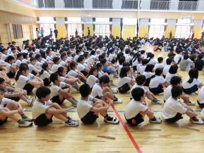連休谷間の児童朝会がお行われました。とは言え、子どもたちの様子はいつも通り。集合が終わる頃には自然と私語がやみ、快くスタートする芦花小全員の朝です。立派な姿勢で座っています。