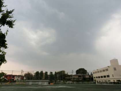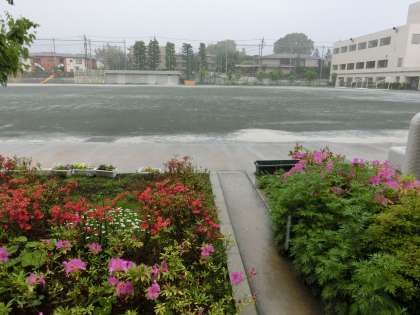 天気予報通り、昼過ぎから空模様が急変しました。暗雲が広がり、雷が鳴ると、校内からは子どもたちの悲鳴も。土砂降りの雨で、校庭にはあっという間に水たまりが出来ていました。夏の夕立を思わす風情です。