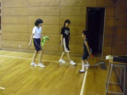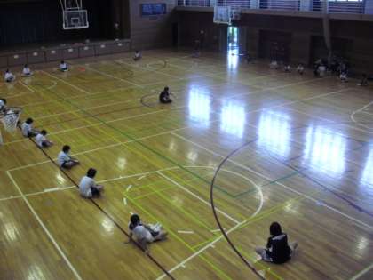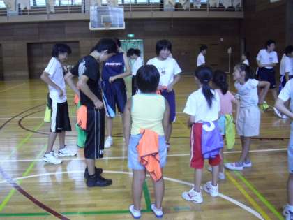 サマーワークショップ「バスケットボール」の最終回がありました。まず、小中学生が輪になって準備運動です。その後は、体慣らしを兼ねて、ゼッケンをズボンの後ろに挟んで、しっぽの様にして自分のしっぽを取られないように相手のしっぽを取り合うゲームを楽しみました。