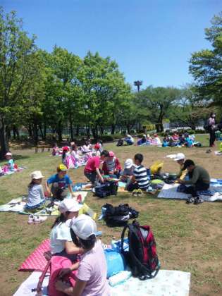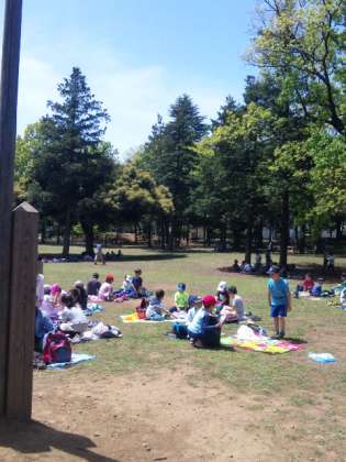 芝生でお弁当タイムです。朝早くからのお弁当作りありがとうございました!みんなしっかり食べていますよ〜