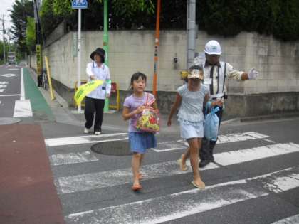 水泳教室期間中、主事さん方は子どもたちの安全な登下校のために、5・6年生登校時、3・4年生登校及び5・6年生下校時、1・2年生登校及び3・4年生下校時、1・2年生下校時と計4回、手分けをして2ヶ所の交差点で登下校指導をしています。暑い中、毎回、子どもたちの安全を確かめながら見守っています。