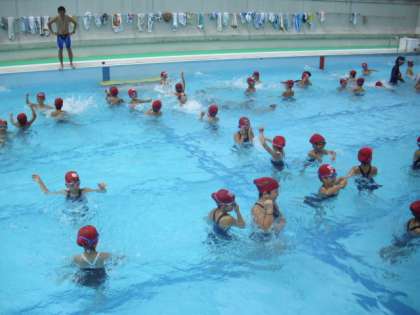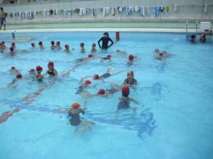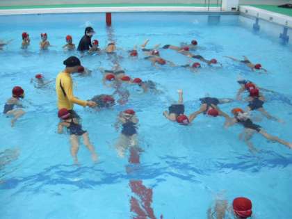 今日も、1・2年生の時間帯に日差しが射し込んできました。毎回、参加人数が一番多いこの時間は、子どもたちの元気な声が響き渡ります。「10数えるまで潜ってみよう」「水の中でジャンケンして勝った人はお水をかけちゃおう」など、水遊びを中心に指導をしています。水と仲良しになれたかな?