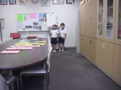 算数タイムの後に出席カードを届けにきた子どもたちは、