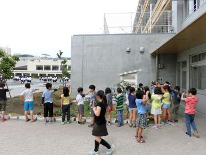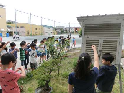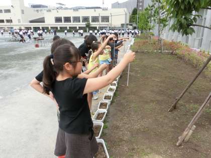 一人1本ずつ温度計を手に、4年生が百葉箱の周りに集まってきました。理科の学習で、気温測定を行っています。教室で確認してきた通り、適切な測定位置を守って、しばらく目盛りとにらめっこしている姿が印象的でした。