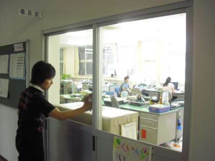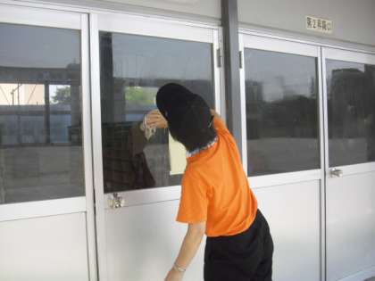 今日は、汚れの目立つ窓ガラスをきれいに拭いている主事さん。校舎内だけでなく、校庭の砂ぼこりをかぶった外側の窓ガラスもきれいにしています。校舎内外の整備も順調に進んでいます。