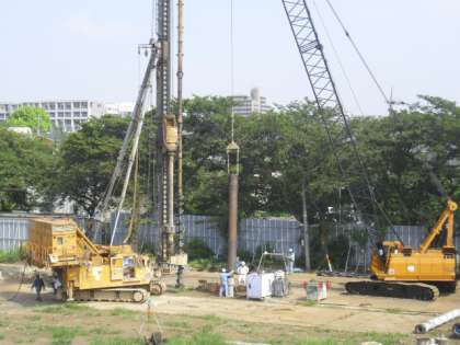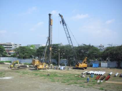 今日の工事の様子です。左の重機には大きなドリルがあり、穴を掘っています。右の重機は杭を運び、ドリルで開けた穴に打ちこんでいます。新校舎建設の工事が少しずつ進んでいます。